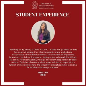 “Reflecting on my journey at DoMS NALSAR, I’m filled with gratitude. It’s more than a place of learning; it’s a vibrant community where academia and extracurricular activities blend seamlessly. The curriculum and experienced faculty foster our holistic development, shaping us into well-rounded individuals. The campus fosters camaraderie, making it easy to form deep bonds with fellow students. The balance between academic rigour and vibrant campus life is a hallmark of my experience here. The competitive atmosphere pushes us to strive for excellence and emerge as leaders. Beyond academics, DoMS NALSAR embraces diversity and fosters connections. Participating in clubs and initiatives has broadened my horizons and contributed to my growth. Looking back, I feel pride in my transformation. From a newcomer to an integral part of this dynamic community, DoMS NALSAR has shaped my identity. The memories, lessons, and friendships will always hold a special place in my heart. My time at DoMS NALSAR has been transformative. It’s a home away from home, leaving an indelible mark on my journey of growth and self-discovery.”