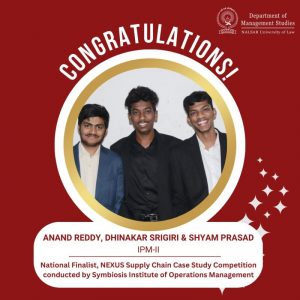 We congratulate Anand Reddy, Dinakar Sirigiri and Shyamprasad Lingala for standing as National Finalists at Nexus Supply Chain Case Study Competition at the Symbiosis Institute of Operations Management!