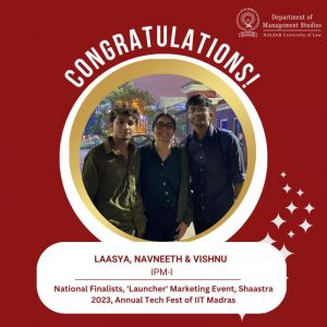 We congratulate laasya rayaprolu, Navneeth Menon and vishnu aji for representing the University as National Finalists in Launcher Marketing Event at Shaastra 2023 – the Annual Tech Fest of Indian Institute of Technology, Madras!