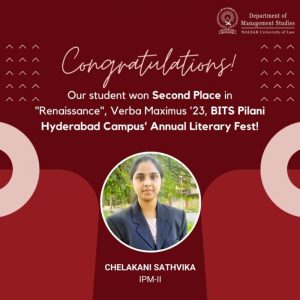 We congratulate Sathvika Chelakani for winning Second Prize at Verba Maximus – BITS Pilani, Hyderabad Campus‘ Annual Literary Fest!